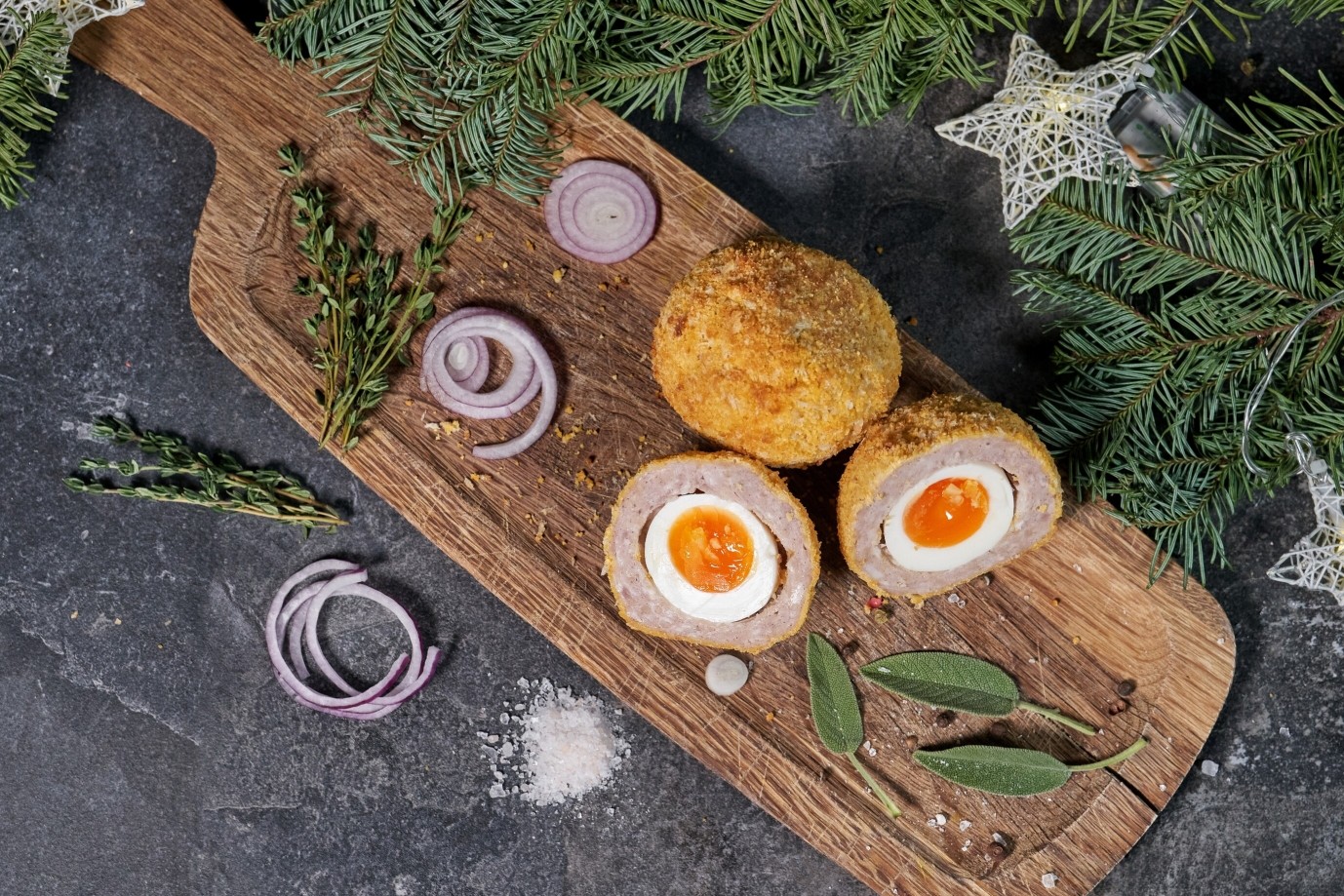 Ingredients : EGG,sausagemeat(Pork,Rusk(WHEAT Flour,salt)Water,Spices,SULPHITES.E221,E621,E450ii) Breadcrumbs(WHEAT Flour,salt.