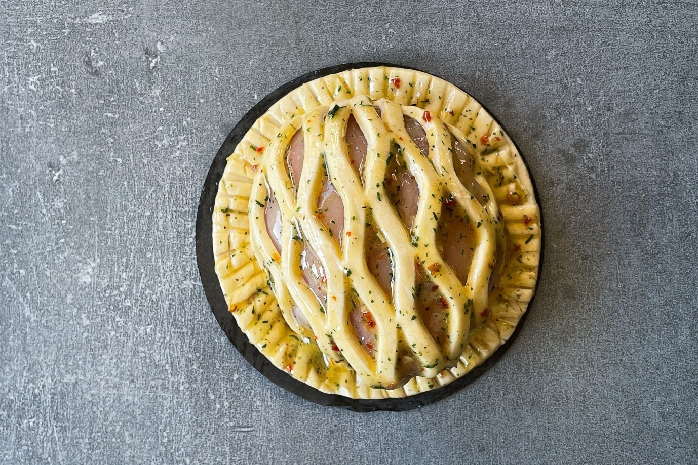 Ingredients: Chicken, pastry(WHEATFLOUR,margarine,water,salt,butter, oil, SOYA.) Glaze (rapeseed, sunflower, linseed oil, onion, garlic, salt, pepper, caraway seed, paprika, cumin,thyme, oregano, rosemary, antioxidant, ascorbic acid, guar gum, gelatine, Butter oil, glucose syrup, Milk protein), modified tapioca starch, milk protein, ) whipped cream, stabiliser: xanthan gum, lactic acid, citric acid, glucono-delta-lacton,potassium sorbate.