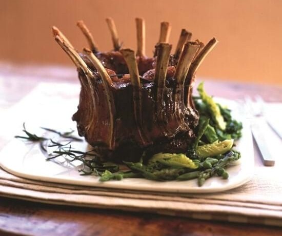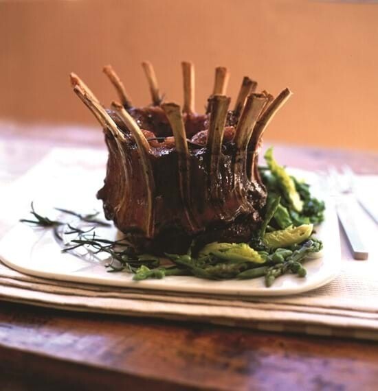 1. Preheat the oven to 180-190°C, 160-170°C Fan, Gas Mark 4-5. 2. Weigh the joint and calculate the cooking time. Make several deep and wide slits into the joint between the bones, season and stuff with the herbs. Place onto a rack in a roasting tin and open roast in a preheated oven for the calculated cooking time. 3. 10 minutes before the end of cooking remove the joint and brush with the mint jelly and return to the oven. 4. Lightly steam a selection of seasonal spring vegetables. Mix together the butter with the mint. Once the vegetables are cooked transfer to a hot serving dish and melt over the mint butter. 5. Serve the lamb with the minty spring vegetables and boiled new potatoes