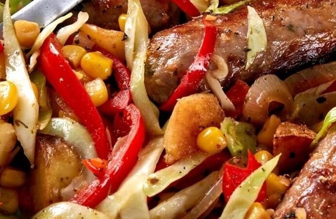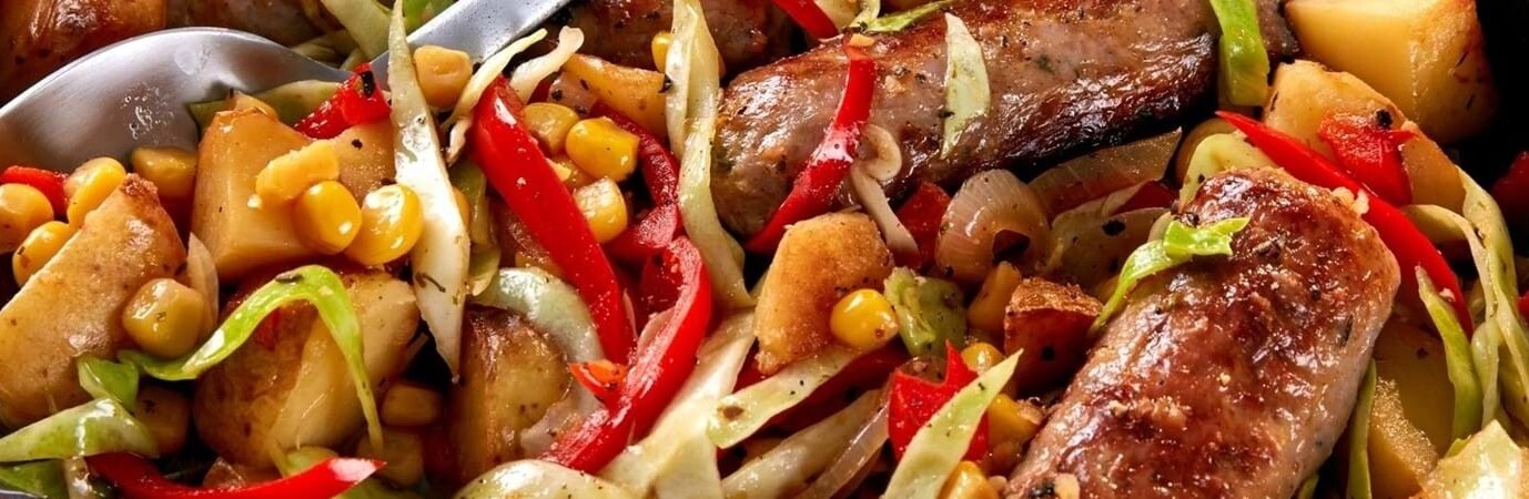 1. Heat the oil in a large non-stick pan over moderate heat and cook the sausages and potatoes for 3-4 minutes or until brown all over. Transfer to a plate and set aside. 2. In the same pan add the onion, peppers and garlic purée or paste. Cook for 2-3 minutes until soft but not coloured. 3. Return the sausages and potatoes to the pan and add the apple juice or cider, stock and herbs. Season, reduce the heat, cover and cook for 15 minutes. Add a little more stock, if required. 4. Add the cabbage or kale and sweetcorn. Cook uncovered for a further 2-3 minutes. 5. Divide between four shallow bowls and serve.