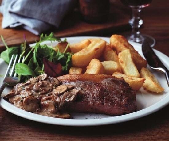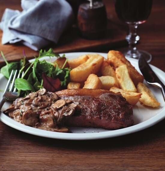 This classic retro steak dish is quick to prepare and cook. Sirloin, rump or rib-eye steaks pan-fried and served with a sauce made with mushrooms, onions, mustard, stock, cream and herbs